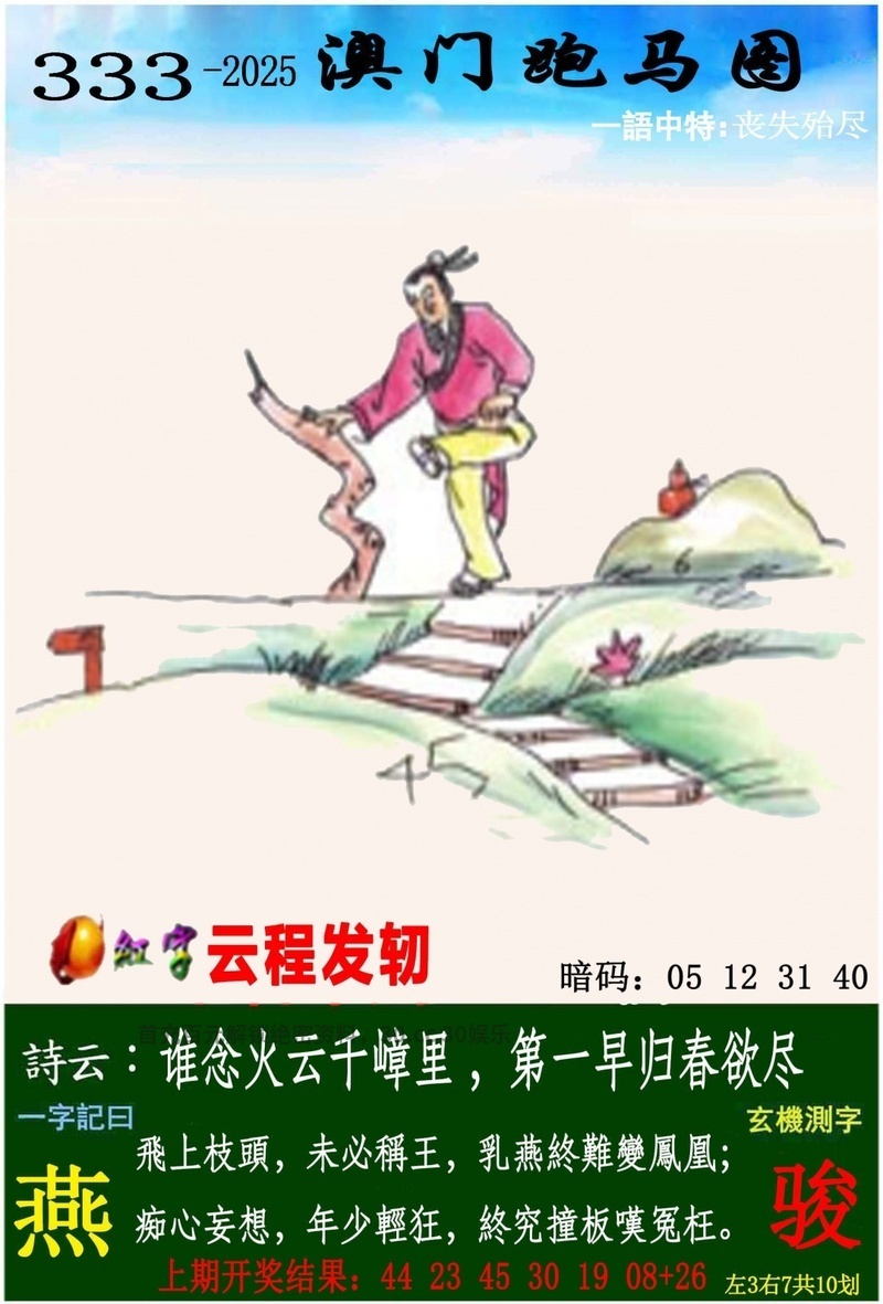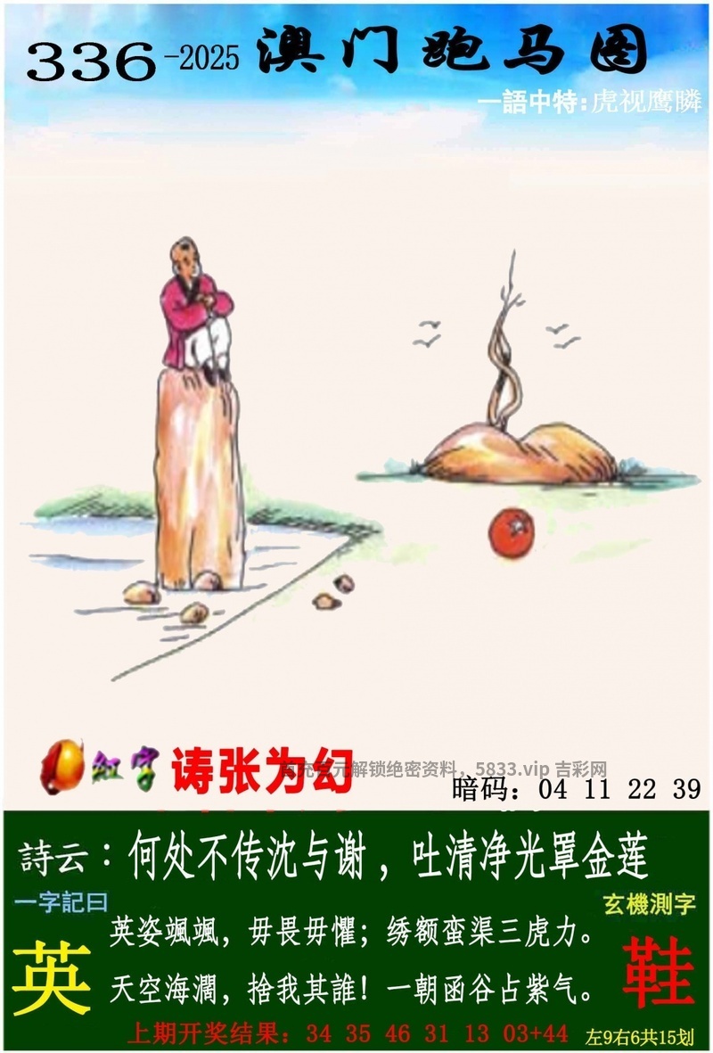 传真336期 今期生肖三四开,穿金戴银戴兰花。 三七相合是特码,红艰两波发大家。 春风得意发财时,田叶荷花莲藕香。 生意兴隆才禄进,乾坤运转喜事多。 山清水秀 解:今期三七相合是特码,解单肖兔牛猪鸡羊蛇,红艰两波发大家,解红波。 拐特生肖:龙蛇牛狗马羊鼠虎鸡 主特:26.38.13.25.17.29.20.32.24.36.23.35 |